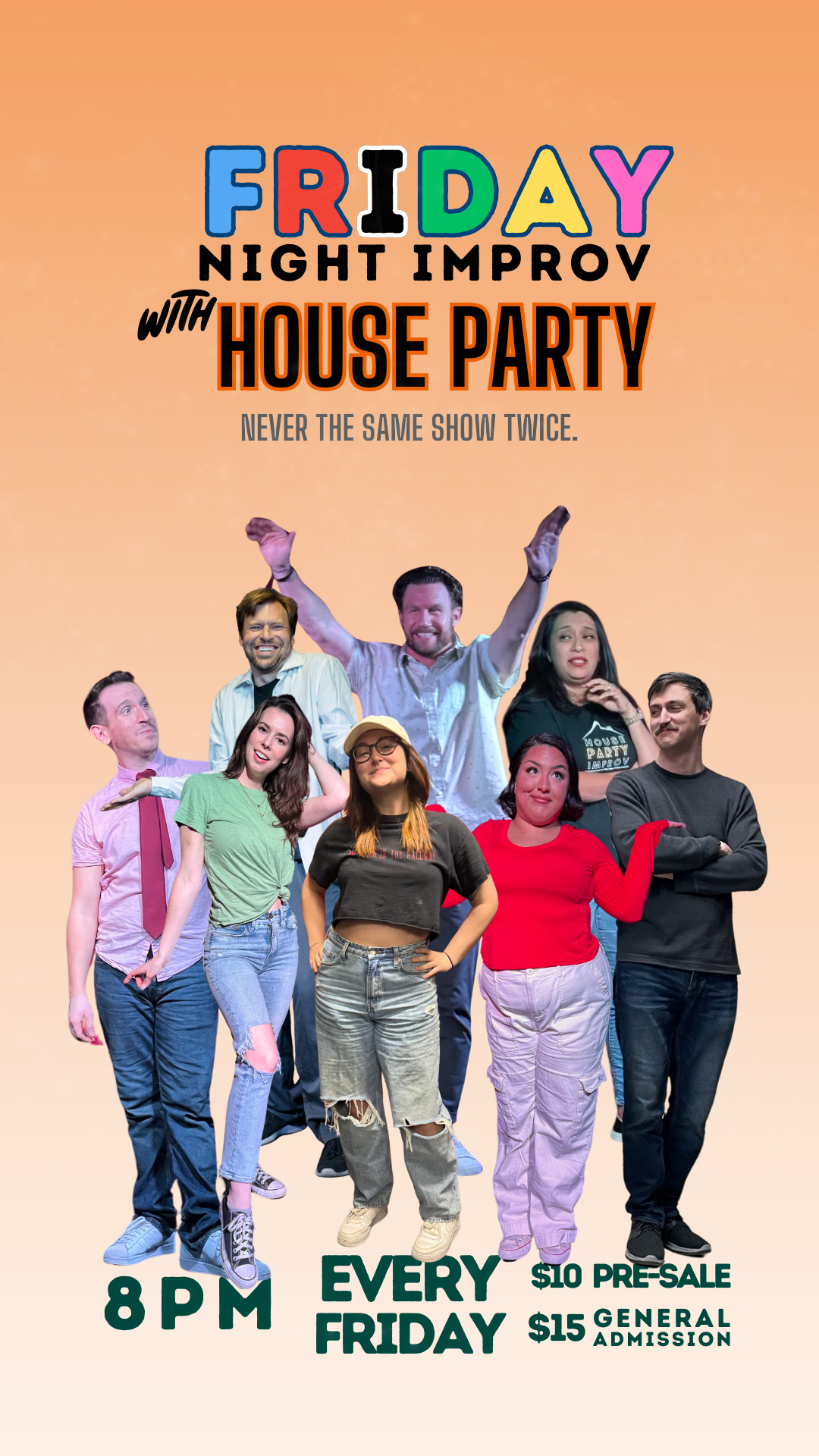 Bring your friends, or make it a fun date night! Grab a drink at the bar, settle into the beautiful 985 seat theater, and watch House Party make up an entire comedy show on the spot with musical accompaniment by Jaime Ramirez and special guest performers!