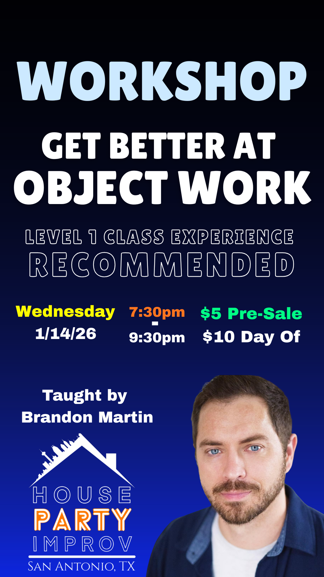 *Though no experience is required, this is not a introduction to improv, we recommend this workshop to those who have completed a level 1 improv class.