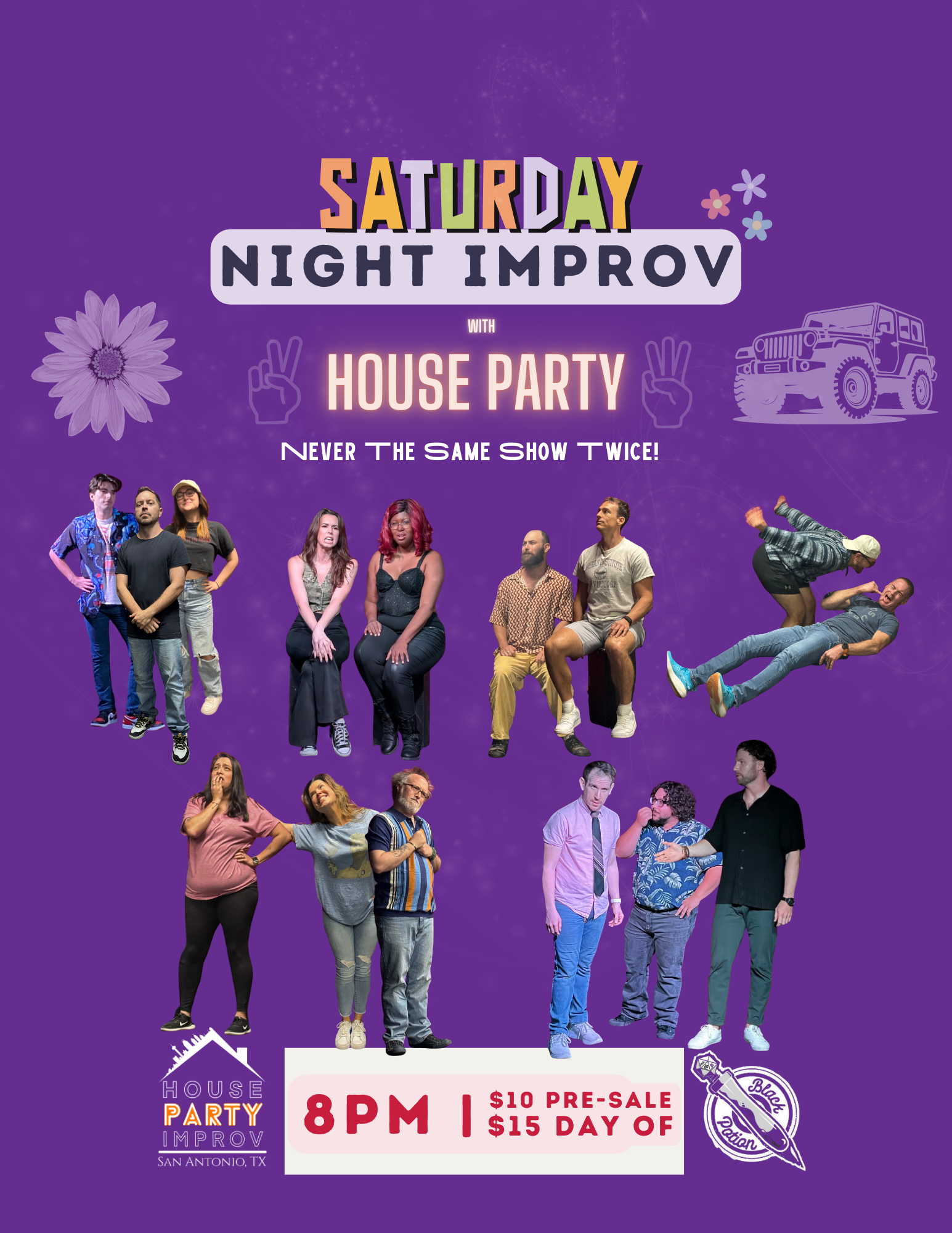 This is our staple show and the best weekly comedy show in San Antonio. Every Friday evening, a brand new comedy show is made up on the spot by the cast of our house troupe House Party. The show is a variety of acts including short form games like you would see on Wild Nβ Out or Whose Line Is It Anyway followed by Long-form sets that can be described as a collection of connected skits or a hilarious improvised narrative play. Guest performances from other improv teams to stand up comics grace our stage often from all over San Antonio, Austin, and all across the country.