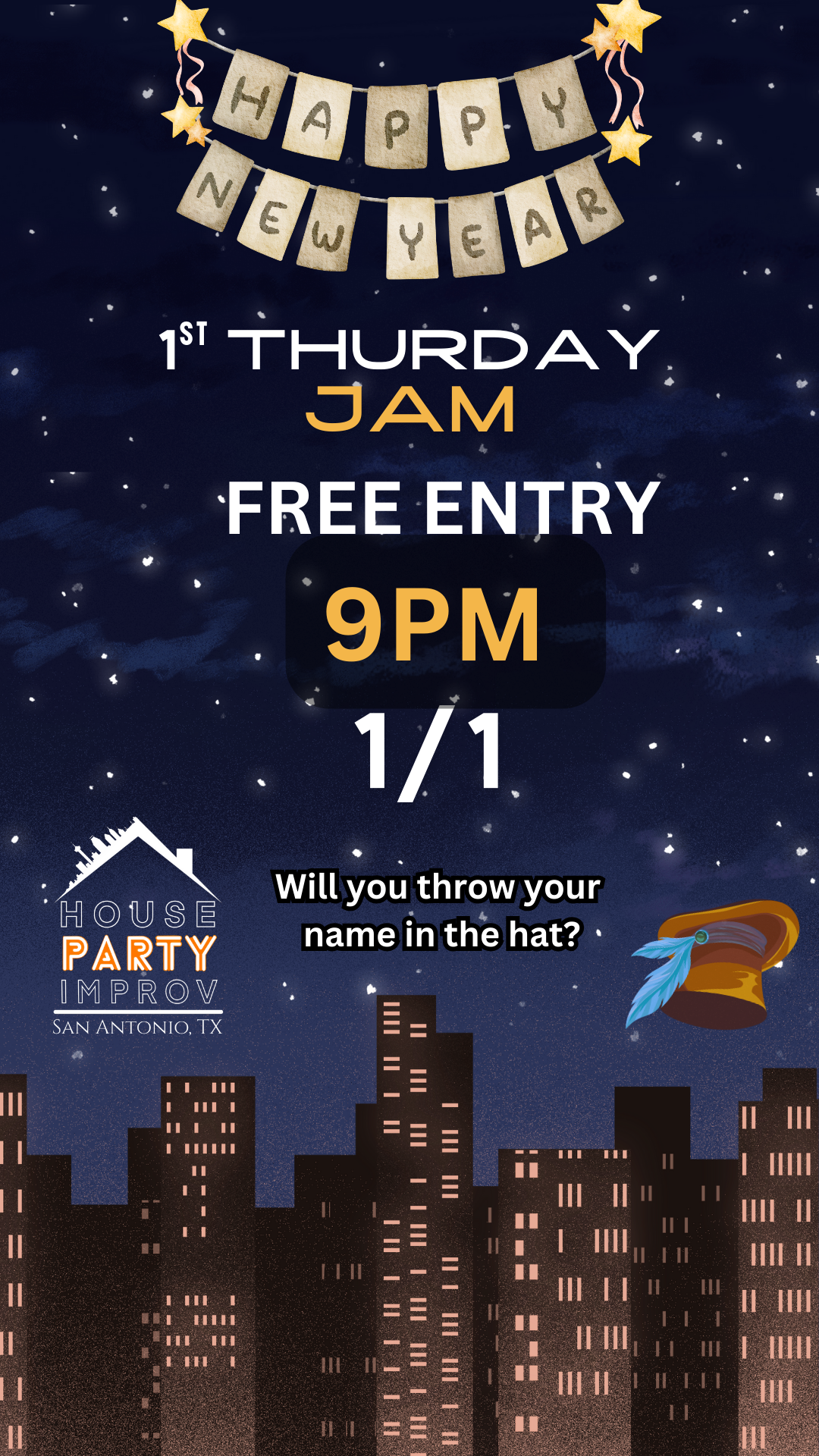 Happy New Year! Kick off 2026 by coming to jam with us! Throw your name in the hat for a chance to hop on stage yourself. Or just watch the chaos unfold as both experienced and brand new performers will be thrown together and do an improvised comedy set right on the spot!