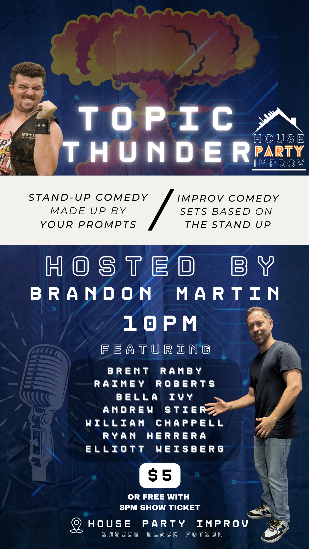 This show has become a fan favorite already as House Party Improv invites hilarious local stand-up comedians to our stage but all their material will be made up on the spot based on your prompts! If that wasnβt enough it is followed by improv performers bringing those bits to life!