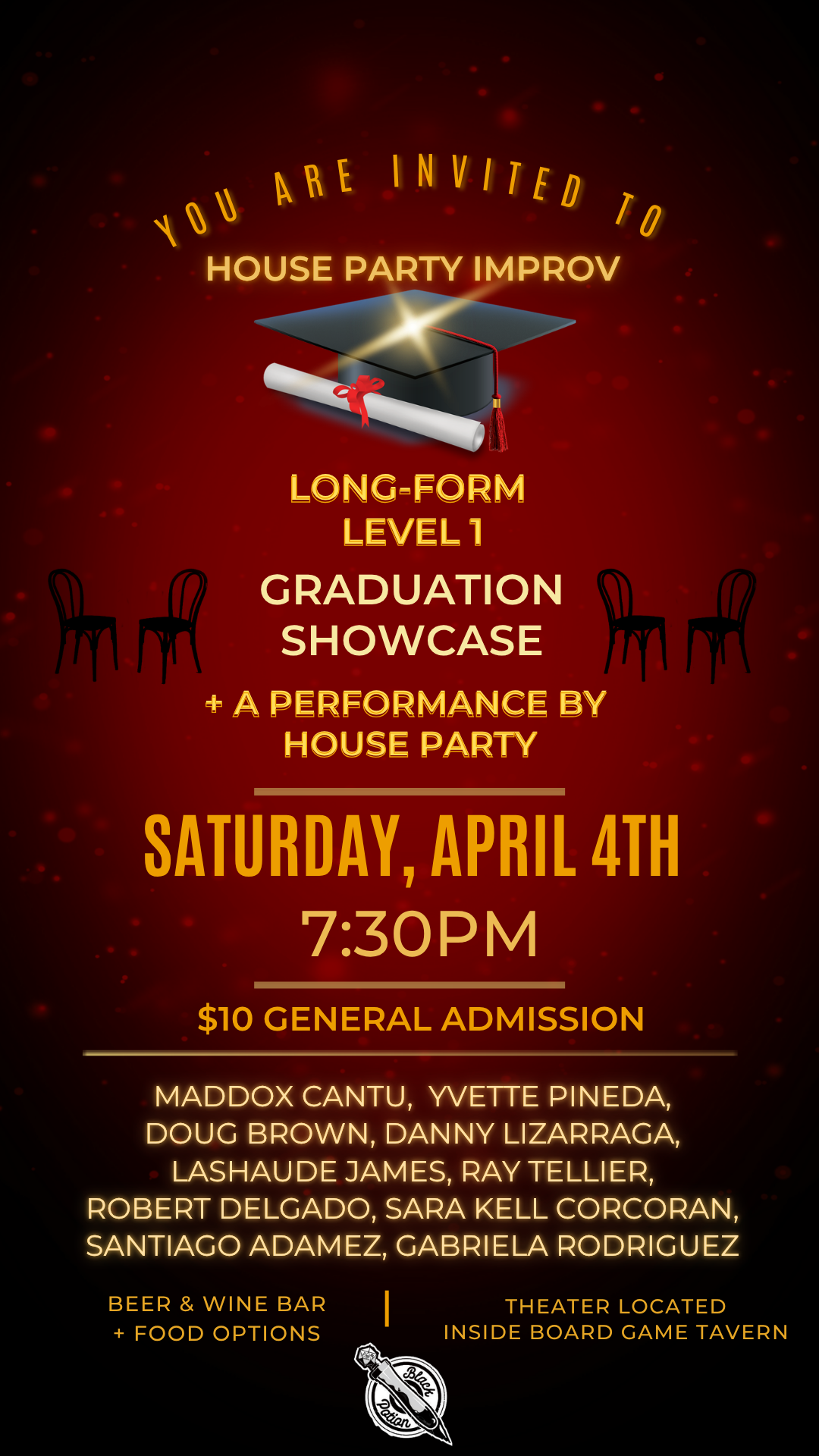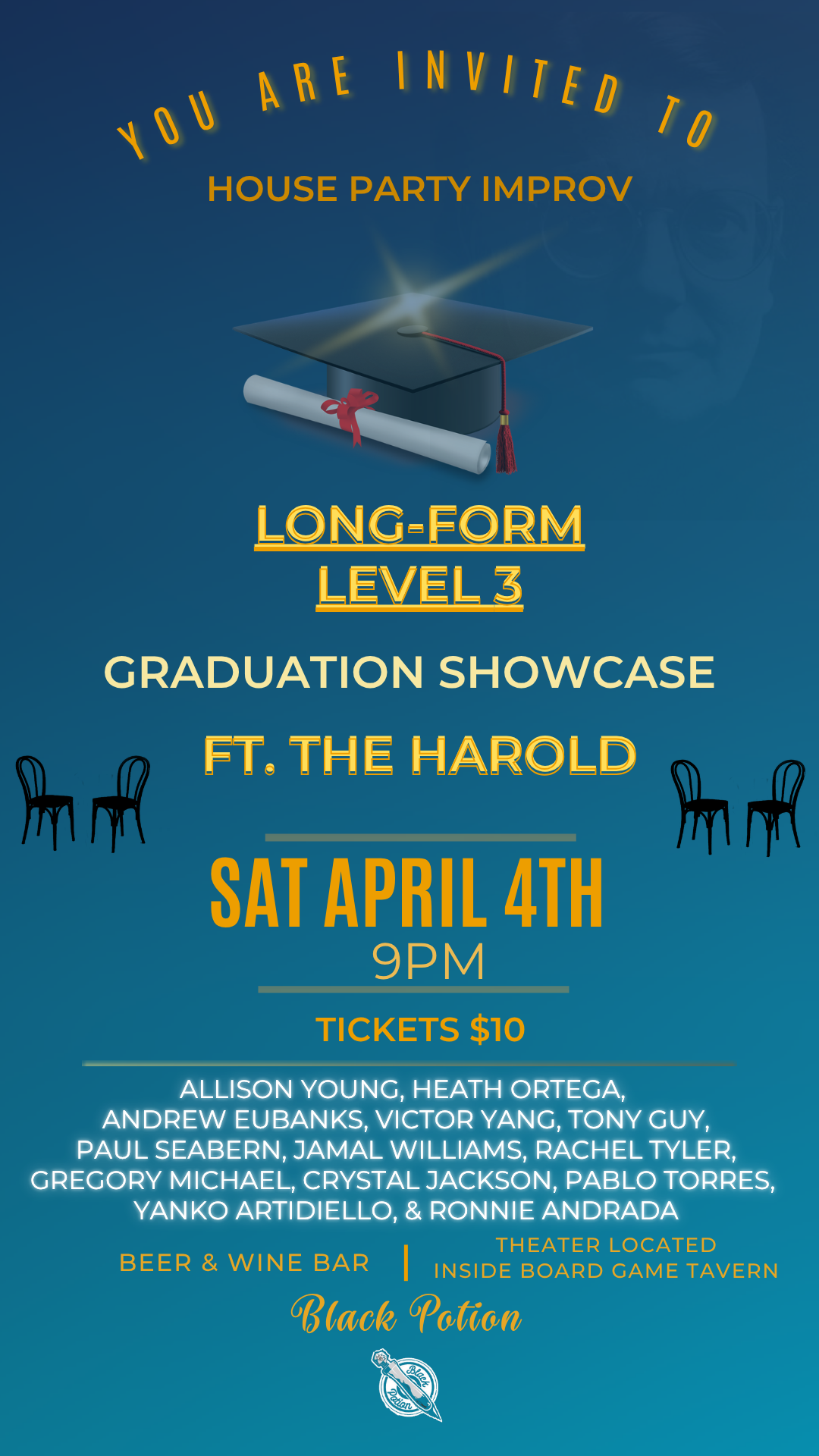 8pmThis special show will feature the graduation showcase of our latest Long-form: Level 1 students. Grab a drink at the bar, and settle into a wonderful hidden theater located inside of Black Potion and support these funny fresh improvisers. Maybe one is even your family member or friend? Whether you know them or not, discover your new favorite performer! All that plus House Party, our signature house troupe will close out the show making hilarious absurdity out of your true stories.