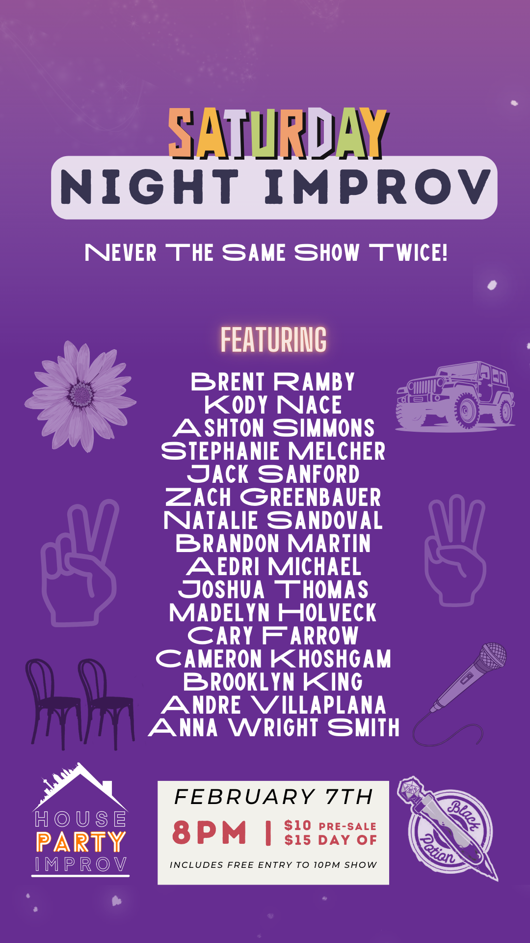 This is our staple show and the best weekly comedy show in San Antonio. Every Friday evening, a brand new comedy show is made up on the spot by the cast of our house troupe House Party. The show is a variety of acts including short form games like you would see on Wild N’ Out or Whose Line Is It Anyway followed by Long-form sets that can be described as a collection of connected skits or a hilarious improvised narrative play. Guest performances from other improv teams to stand up comics grace our stage often from all over San Antonio, Austin, and all across the country.